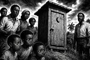 Resisting the temptation to imprint a pot spoon unto eldest son’s backside, Mrs. Ann instead returned to the yard. In the distance, she could hear the creaking latrine door swinging on its rusty hinges, as the earthy smell of shit arose with the rising sun. Someone must have left the latrine door open, she said to herself. Then a second thought entered the window of her mind. “Meh boy, meh boy,” cried the barefooted Mrs. Ann, running frantically up the hill.